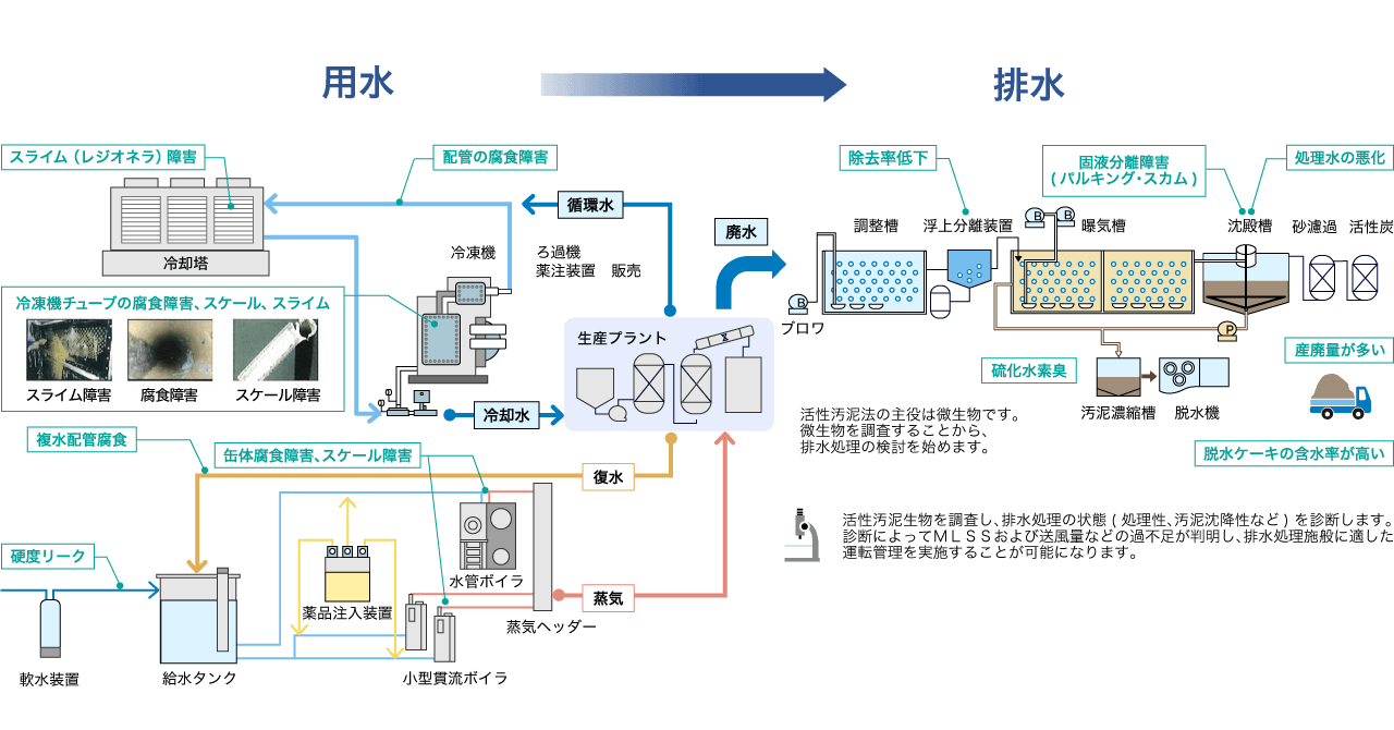 『生物からみた処理機能診断』によりトラブルの原因を的確に把握し、効率よくトラブルを解消・防止します。